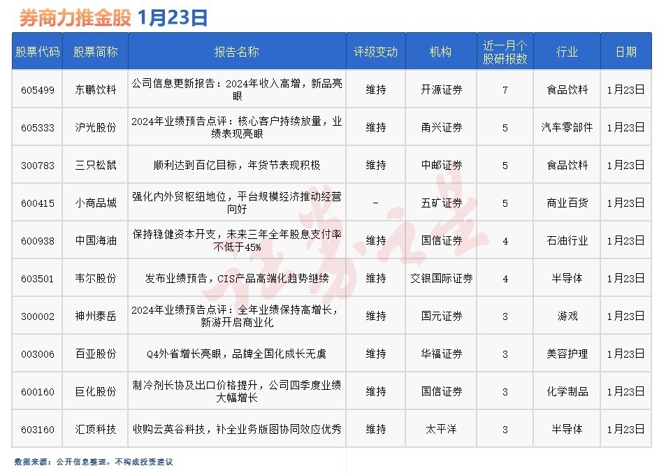 据证券之星数据库不完全统计,1月23日券商共给予超30家A股上市公司“买入”评级。从行业分布看,券商1月23日关注的个股聚焦于食品饮料、汽车零部件、商业百货、石油行业、半导体、游戏、美容护理、化学制品等行业。